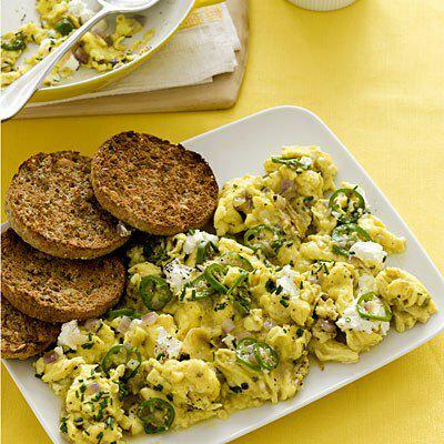 - Снимите сковороду с огня, добавьте кусочки козьего сыра и нашинкованный зелёный лук и быстро перемешайте. Подавайте сразу же к столу с горячими тостами или кусочками цельнозернового хлеба.