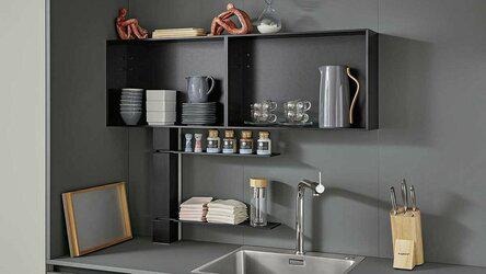 Обладателям большого набора посуды, кастрюль, ковшиков и сковородок точно понравится такой вариант хранения: здесь ни один предмет не будет потерян в хаосе. И доставать что-то с полки, чтобы залезть вглубь, не нужно — выдвижные механизмы удобны именно этим.