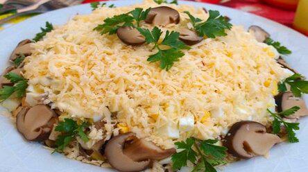 В довершение сверху посыпаем тертым сыром и украшаем нарезанными пластинками грибов.