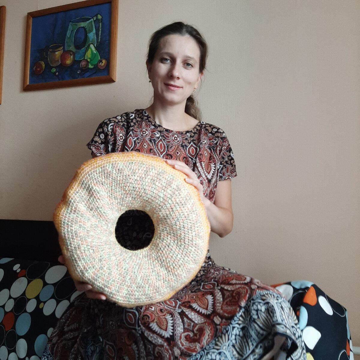 Теперь я распустила жилетку и связала из неё и другой пряжи бывшей в употреблении подушку для сидения на полу. Детям очень нравится такая штука, они используют её как для игры, так и для занятий.