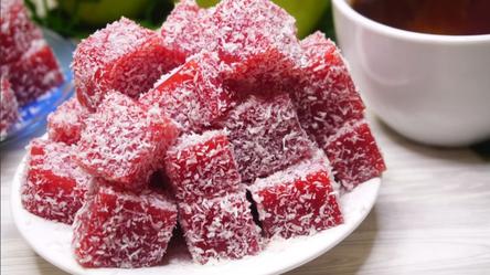 Мармелад извлекаем из формы и разрезаем на кубики. Можно оставить так, можно обвалять в сахаре, но сахар потом может подтаять, мне нравиться обваливать в кокосовой стружке.