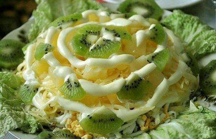 Варенные яйца натираем на крупную терку, смазываем майонезом. Нарезаем консервированные ананасы мелкими кубиками, выкладываем следующим слоем и смазываем майонезом.