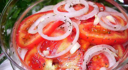 Закуска из помидоров и лука. Закуска получается в меру соленая, в меру острая, в меру пикантная, и очень вкусная!