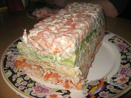 Этот салат подходит для любого праздника. Интересен этот рецепт тем, что ингредиенты схожи с теми, которые нужны для приготовления суши, и по вкусу салат напоминает именно их.
