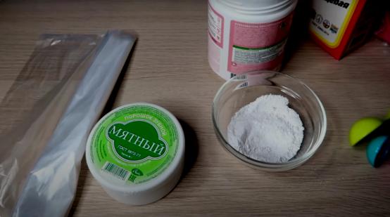 Второй вариант рецепта – если не найдете зубной порошок. Его легко можно заменить на зубную пасту. Беру самую дешевую, но сильно и хорошо пахнущую. К выдавленной пасте добавляю опять же соду и стиральный порошок, тоже самый дешевый.