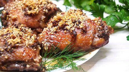 Теперь противень смазываем растительным маслом, кладем курицу, закрываем фольгой и ставим в разогретую духовку. Готовим при 200 градусах, 40-50 минут, до готовности курочки, теперь снимаем фольгу, пожеланию можно еще посыпать грецким орехом и ставим еще на минут 10-15 минут до румяности курочки.
