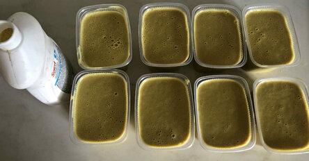 Разлейте массу по контейнерам. Средство после остывания загустевает. Разбавьте массу водой 1 : 1, чтобы перелить в бутылку и пользоваться им как гелем для мытья посуды.