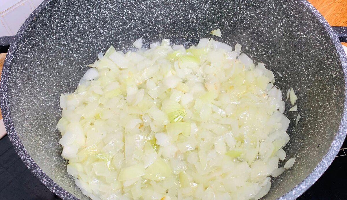 Лук нарезаем полукольцами и обжариваем до золотистости.