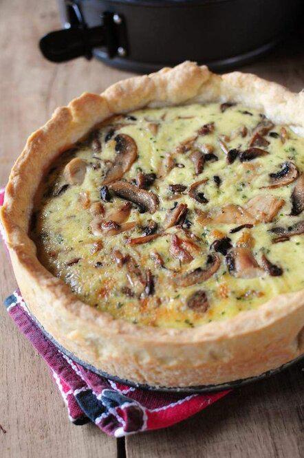 Ингредиенты: 250 г муки; 75 г. сливочного масла; 1 щепотка соли; 3 ст. л. воды; 4 яйца; 400 г. шампиньонов; 1 луковица; 1 ст. л.сливочного масла; 125 г сметаны; 1 ст. л. петрушки; соль и перец по вкусу.