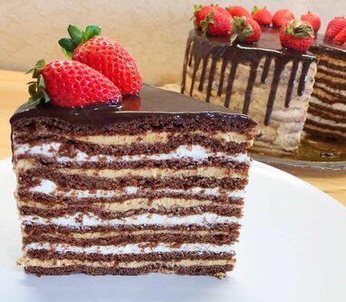 11. Коржи перемазать заварным кремом, посыпая орехами. Оставить при комнатной температуре на 1-2 часа, чтобы коржи пропитались.