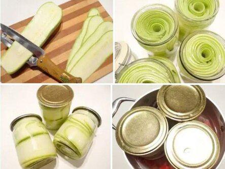Проще заготовок я еще не закрывала. Зимой Вам останется обмакнуть кабачки в муку, а затем во взбитое яйцо с солью и обжарить на растительном масле. Дать кабачкам остыть, а затем завернуть рулетики с начинкой.