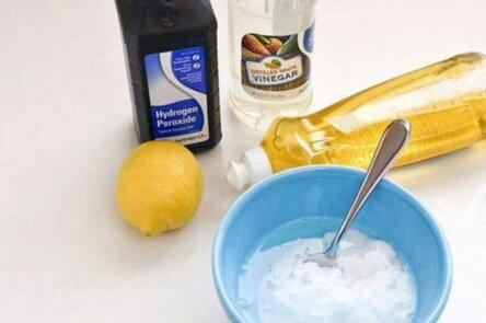 Берем: четверть стакана жидкости для мытья посуды, четверть стакана пищевой соды и четверть стакана перекиси водорода, 1 ст. л. уксуса, цедру 1 лимона, губку для мытья посуды и бумажные полотенца.