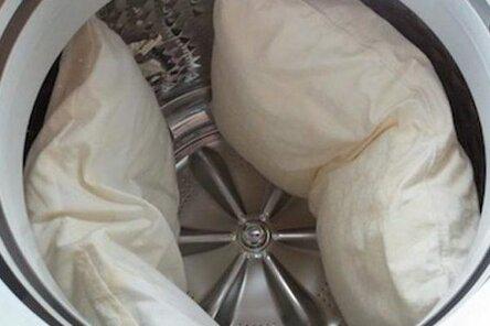 Прежде всего, подушки стираются без наволочки и чехла. Кроме того, чтобы подушка не сбилась, а стиральная машинка сохраняла баланс во время стирки, поместите сразу две подушки в барабан.