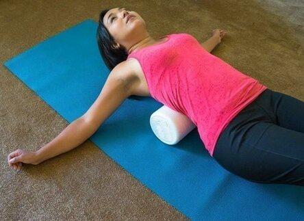 3. Опускаемся на валик-полотенце, чтобы он был поперек вашего тела, т.е. под поясницей (под пупком).