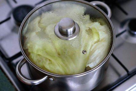 Первым делом займись капустой. Сними верхние листы, поставь кипятиться воду в большой кастрюле, когда вода закипит, опусти капусту целиком и подожди, пока листья начнут отделяться. Повари отделившиеся листья еще 2 минуты, после чего можешь доставать их и остужать.
