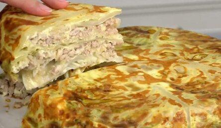 Дальше второй слой капусты и оставшаяся начинка. Снова заливка. Верхний слой — капуста. Накрываю, что получился «пирог».