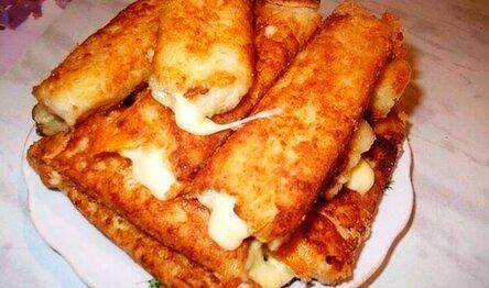 Взбиваем яйцо с солью и перцем по вкусу. В другую емкость насыпаем сухари. От теста открываем кусочки, формируем лепешки, внутрь кладем брусок сыра, формируем палочку. Палочки сначала опускаем во взбитое яйцо, потом обваливаем в сухарях и обжариваем со всех сторон в растительном масле.