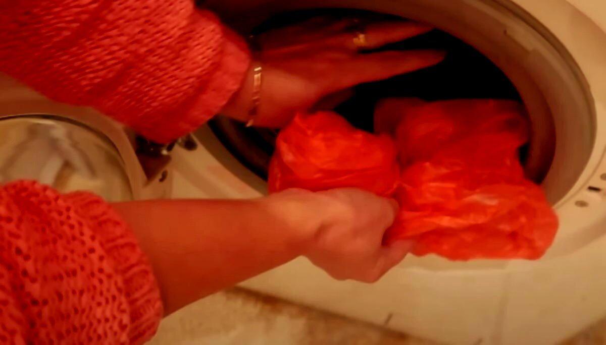 Пару слов, о том какой пакет лучше класть. Маленькие одноразовые пакеты не подойдут. Они тут же разорвутся, попадут в сливное отверстие и забьют его. Следствие – поломка стиральной машины. Выбираем прочный большой пакет. В такие обычно упаковываю бытовую технику. Лучше всего, если он будет бесцветный. Говорят, что цветной может окрасить вещи. Но я вот лично стирала с цветным, и никаких проблем не возникало.