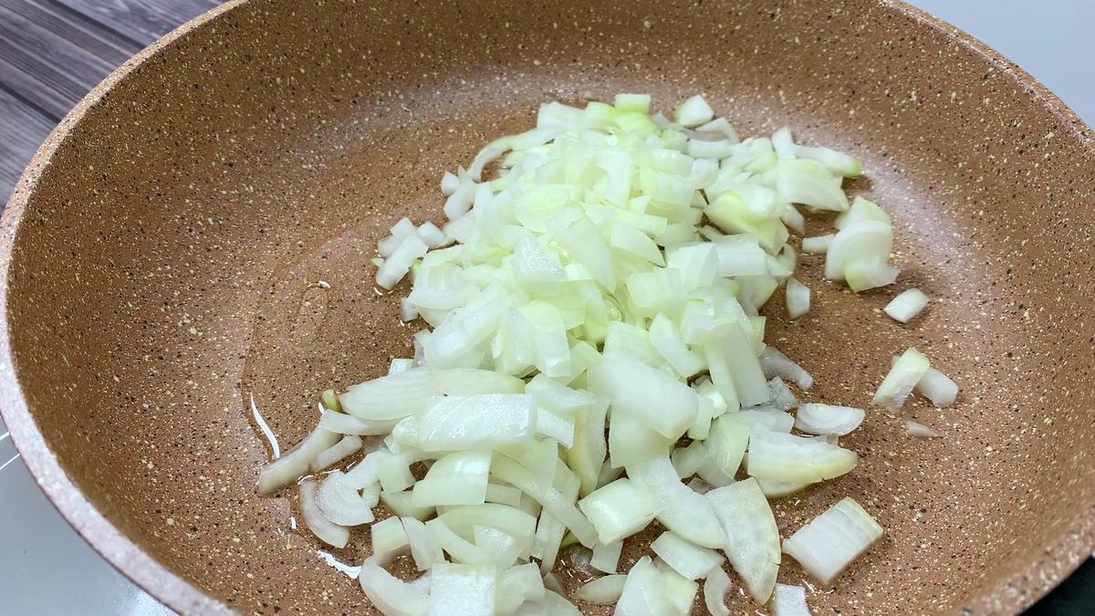 1. Нарезаем мелко лук, натираем морковь на тёрке и отправляем на сковородку. Обжариваем до мягкости лук 2 минуты, потом морковь