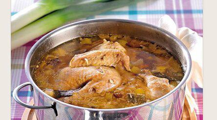Снимите кастрюлю с огня, аккуратно выньте курицу двумя шумовками (она будет разваливаться), положите на блюдо. Кастрюлю с супом верните на средний огонь, всыпьте рис и чернослив, доведите до кипения, варите, иногда помешивая, 30 мин. Приправьте солью и перцем.