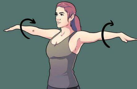 Производим около 15 махов кругового типа вперед, после чего раскручиваем руки в обратную сторону и делаем 15 повторений.