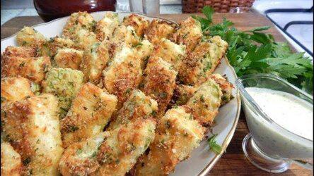 Каждый брусочек кабачка обвалять в крахмале, лишний отряхнуть, обмакнуть в яйцо и запанировать в сыре. Выложить на противень застеленный пекарской бумагой, и слегка смазанный маслом.