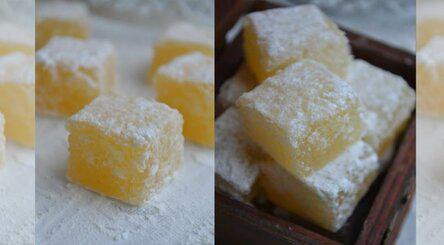 Для сиропа: 500 грамм сахара 150 грамм воды 0,5 ч.л. лимонной кислоты Для теста: 130 грамм кукурузного крахмала 400 грамм воды 2 лимона 30 грамм свежего имбиря (можно не использовать) Для обсыпки: 100 грамм сахарной пудры 100 грамм кукурузного крахмала