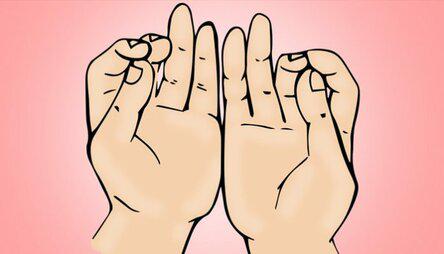 Слегка надавите большим пальцем на мизинец. Самое главное, чтобы оба пальца оставались прямыми. Затем средние пальцы обеих рук должны соприкоснуться друг с другом фалангами. Пусть пальцы, которые остались свободными, устремятся вверх.