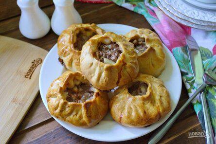 Выкладываем беляши на противень, устланный пергаментом, смазываем каждый взбитым яйцом и ставим их в разогретую до температуры 200 С духовку.