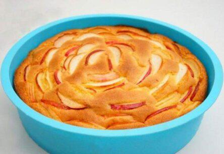 4. Форму выстелить пергаментом или смазать сливочным маслом, припылить мукой. Вылить ½ часть теста, выложить половину яблок нарезанных дольками, сверху залить тестом и выложить оставшиеся яблоки. Если нарезать яблоки кубиками, то можно их добавить в тесто, аккуратно перемешать и потом выложить всю массу в форму для выпекания.