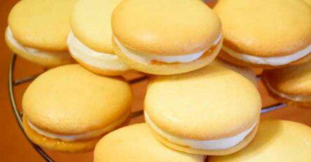 3. Разделите тесто на 2 равных части и поместите их в отдельные кондитерские мешки. Отсадите бисквитное тесто на пергамент в виде кругов диаметром 5 см. Из одной половины теста у вас получится 15 штук.