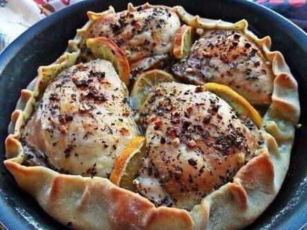 7. Получаем эдакую тонкую пиццу с порцией нежной и ароматной курочки. Даже лимон как с гриля получился.