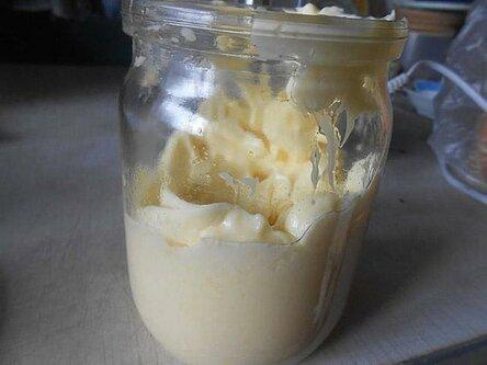 Все влить в баночку 0,5 л. Взять погружной блендер, и, главное, поместить желток внутрь венчика и плотно прижать к баночке ко дну. Взбивать желток, время от времени приподнимать венчик. Взбиваем 2-3 минуты. Вот и готово!