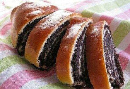 Стол присыпаем мукой и раскатываем тесто в пласт размером 30 на 20 см. Разрезаем вдоль на 2 части. Выкладываем маковую начинку оставляя по 2 см со всех сторон.