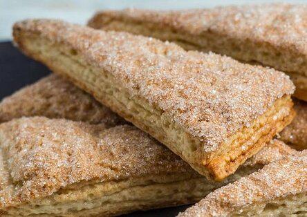 Тесто раскатываем на столе прямоугольником. Раскатанный лист теста равномерно посыпаем одной столовой ложкой сахара. Складываем лист пополам и снова раскатываем в прямоугольный лист.