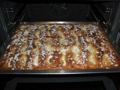 Готовый пирог, остужаем и посыпаем сахарной пудрой.