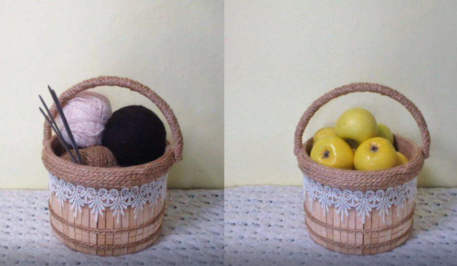 - На прищепках обычно имеются впадины, наложите на них пряжу для вязания, зафиксируйте клеем. Лишние концы срежьте.