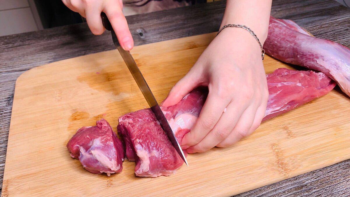 1. Мясо нарезаем на порционные кусочки, шириной 2 см.