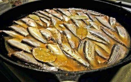 4. Довести до кипения и тушить при закрытой крышке 1.5 часа в сковороде на рассекателе или 2 часа в духовке. Затем охладить. Сразу снять шелуху. Мешать рыбу во время тушения нельзя ни в коем случае.