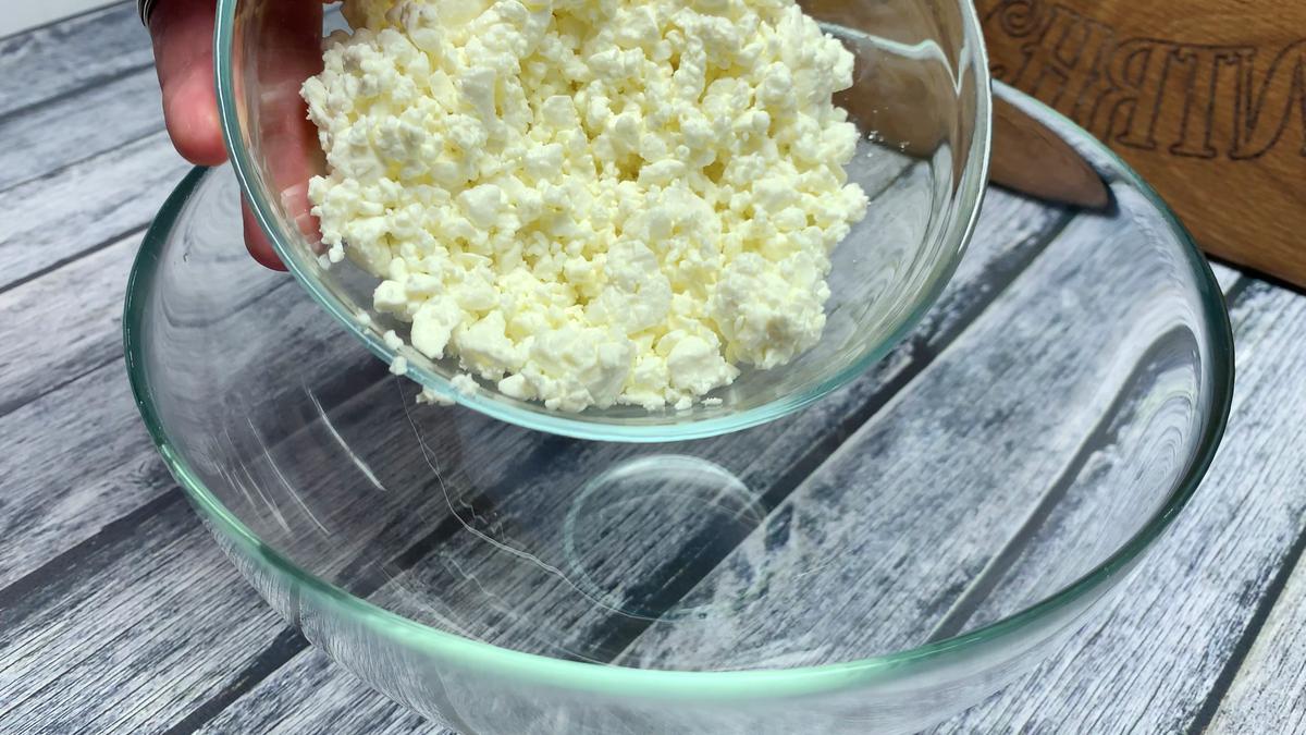 1. Выкладываем творог в миску и натираем сыр.
