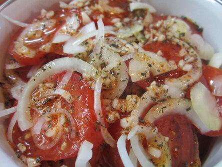Для начала следует вымыть томаты и порезать их (кружками). Чистим репчатый лук и тоже режем: сначала колечками, а потом их перерезаем пополам. Приступаем к приготовлению маринада: в определенной емкости (желательно немаленьких размеров) смешиваем все указанные выше продукты (для маринада). Далее, с помощью ножа, дробим почищенные дольки чеснока и добавляем также ко всем смешанным продуктам. Все хорошо перемешиваем. В отдельной емкости выкладываем слоя из томатов и лука. Наливаем сюда маринад. Не волнуйтесь, что маринада будет мало. Во время маринования томаты дадут большое количество своего сока. Накрываем крышкой и помещаем на 2 суток в холодильную установку. Через указанное время ваша закуска готова к употреблению.