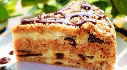 В форму для запекания выкладываем третью часть теста – крошки, кладем на него половину начинки, опять кладем тесто и чередуем слои. Самый верхний слой – тесто – крошка.