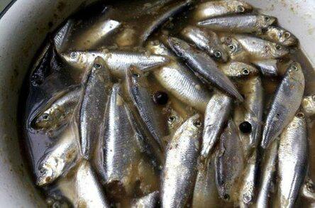 Приготовим вначале рассол. В кипящую воду отправить все специи и проварить минут 10, оставить остыть до комнатной температуры. Тем временем подготовим размороженную кильку, если есть шелуха — чистим, моем. Выкладываем в ёмкость и заливаем остывшим рассолом. Оставляем на сутки при комнатной температуре, у меня + 23 — +24*, затем в холодильник ещё на сутки.