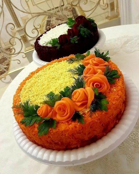 6. Чеддер натираем на мелкой терке и выкладываем следующим слоем. А теперь выкладываем морковь, равномерно распределяем, промазываем майонезом. И, наконец, пришла очередь яичного белка, снова немного смазываем майонезом.