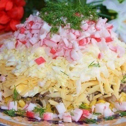 Можно выложить слоями: кукуруза, грибы, лук, сыр, яйца, краб палочки. Смазать майонезом или сметаной.