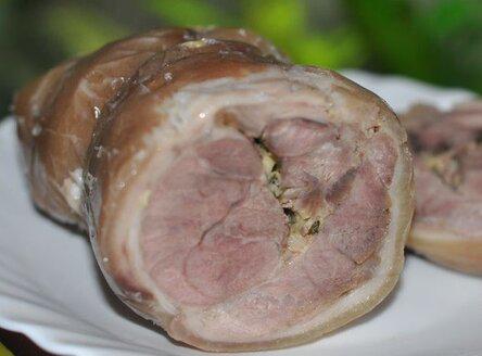 Берем рульку, удаляем кость, так чтобы не повредить шкурку, она будет служить оболочкой. Мясо от рульки отрезаем и отбиваем слегка молоточком с двух сторон, рульку тоже слегка отбиваем с внутренней стороны. Мясо укладываем на рульку.