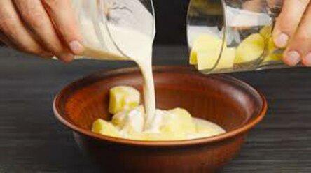 1. Порежьте чищенный картофель на небольшие кубики, залейте их ряженкой.