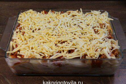 Отправьте на дно формы часть томатного соуса, сверху макароны, затем остальной соус и посыпьте блюдо сыром.