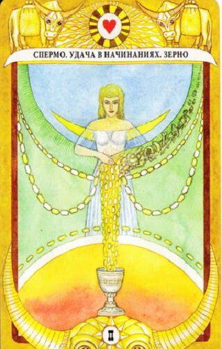 Спермо — одна из дочерей Ания, богиня злаков и зерна. Именно Дионис наделил ее чудесным даром превращать все, до чего Спермо прикасается — в зерно. На аркане изображена девушка которые льет зерно в кубок. Можно сказать, что это не паж кубков, а принцесса кубков.