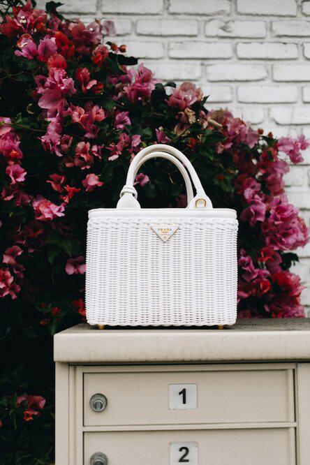 Сумка с жестким плетеным корпусом, которую носят с женственными платьями в цветочек. Такую сумку не обязательно искать у люксовых брендов, в маленьких магазинчиках курортных городов иногда можно найти очень симпатичные и уникальные вещи: